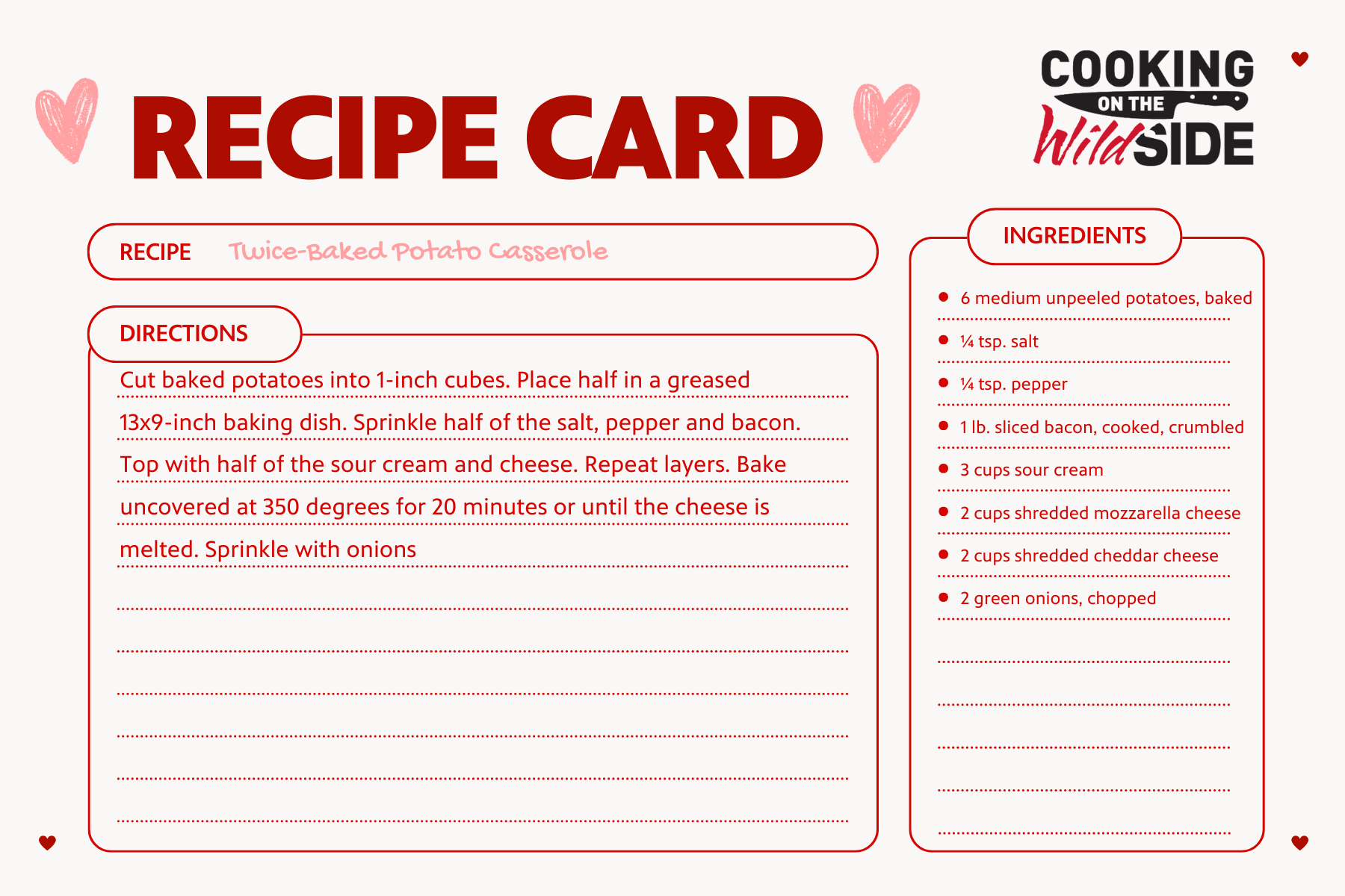 Why bake once, when you can bake twice? This has everything you love about baked potatoes, but in a form that you can put together, stick in the oven and get ready for a great Valentine’s Day that you and your date will surely love.