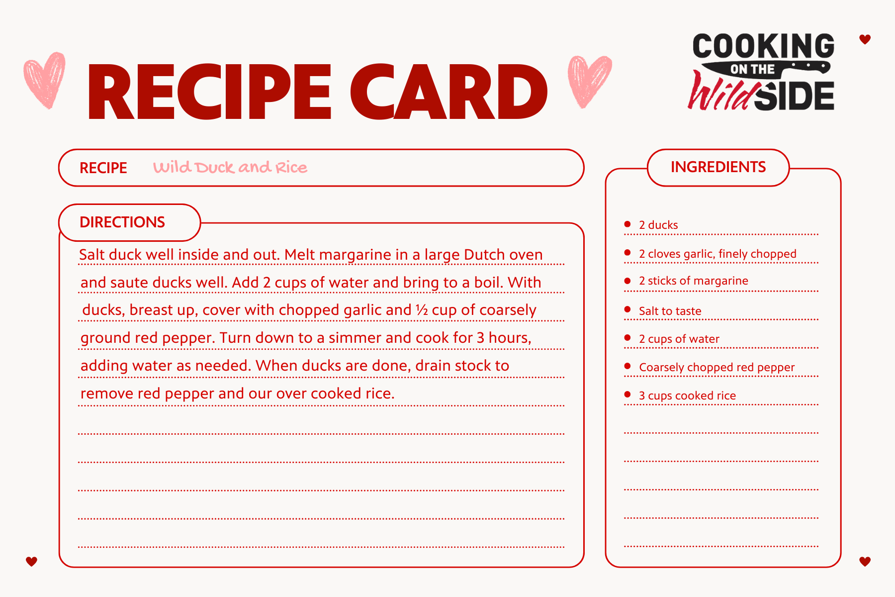 We know you’ve seen the Valentine’s Day decor at the stores the day after Christmas, so we can boast about being later than stores on this one. If you remember last year, we gave stay-at-home dinner ideas from our friends from the Arkansas TV original production “Cooking on the Wild Side.” We’re bringing it back this year with a few new recipes from our “Cooking on the Wild Side” friends to try this year instead of going to an expensive dinner.